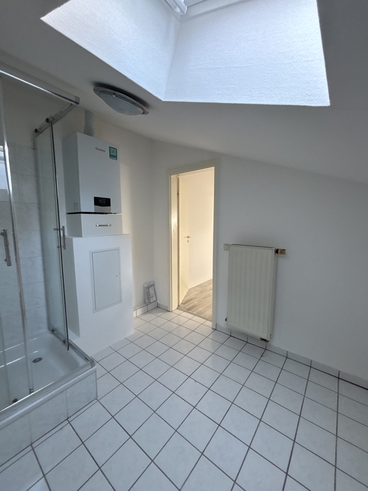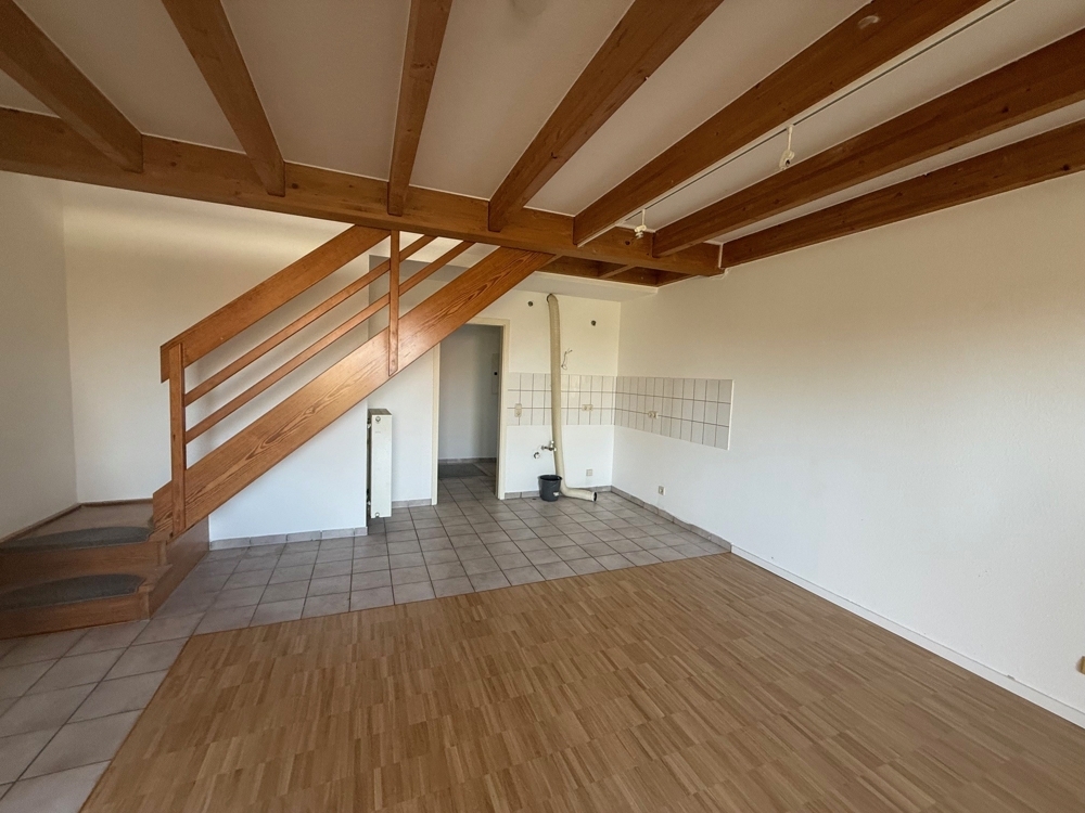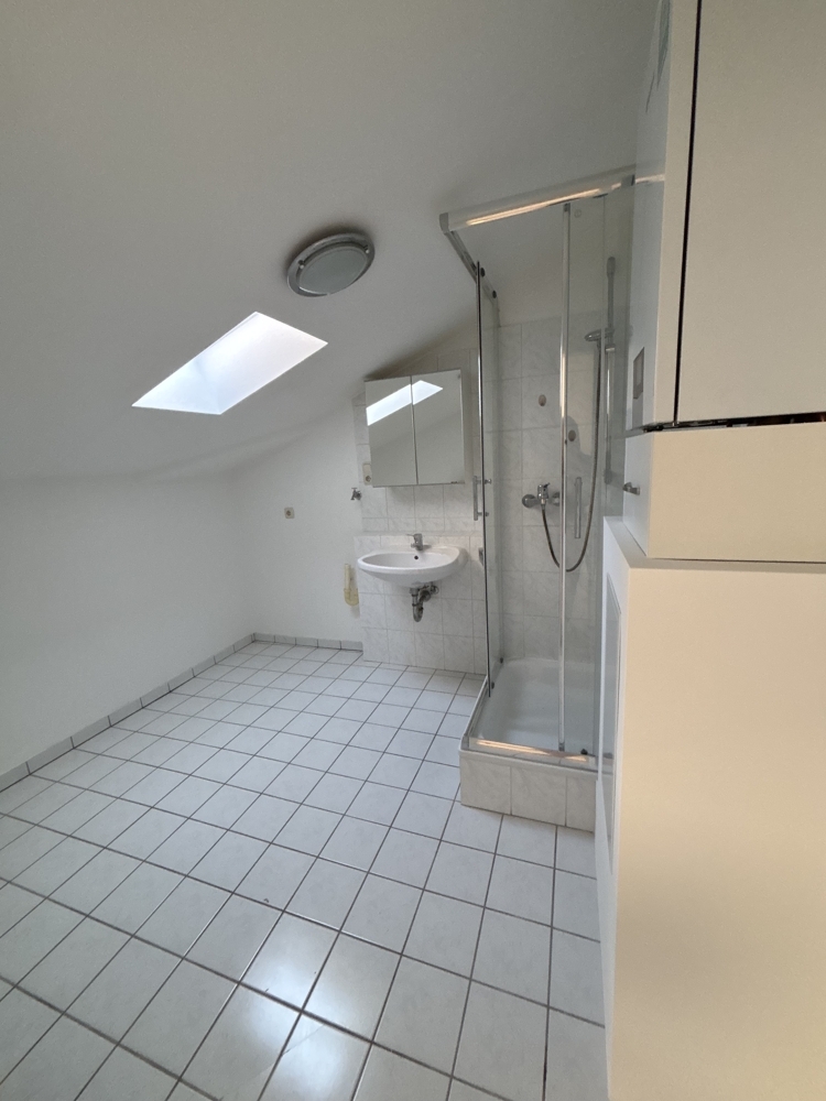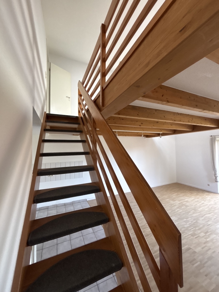 Über eine Treppe im Wohnbereich gelangt man in die obere Ebene der Wohnung. Dort befindet sich das Schlafzimmer, das eine angenehme Rückzugsmöglichkeit bietet. Angrenzend liegt ein großzügiges Badezimmer, das mit einer Dusche ausgestattet ist.
